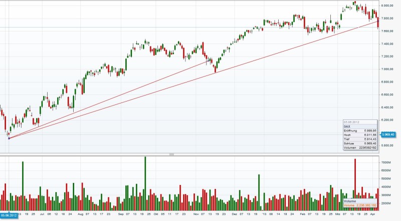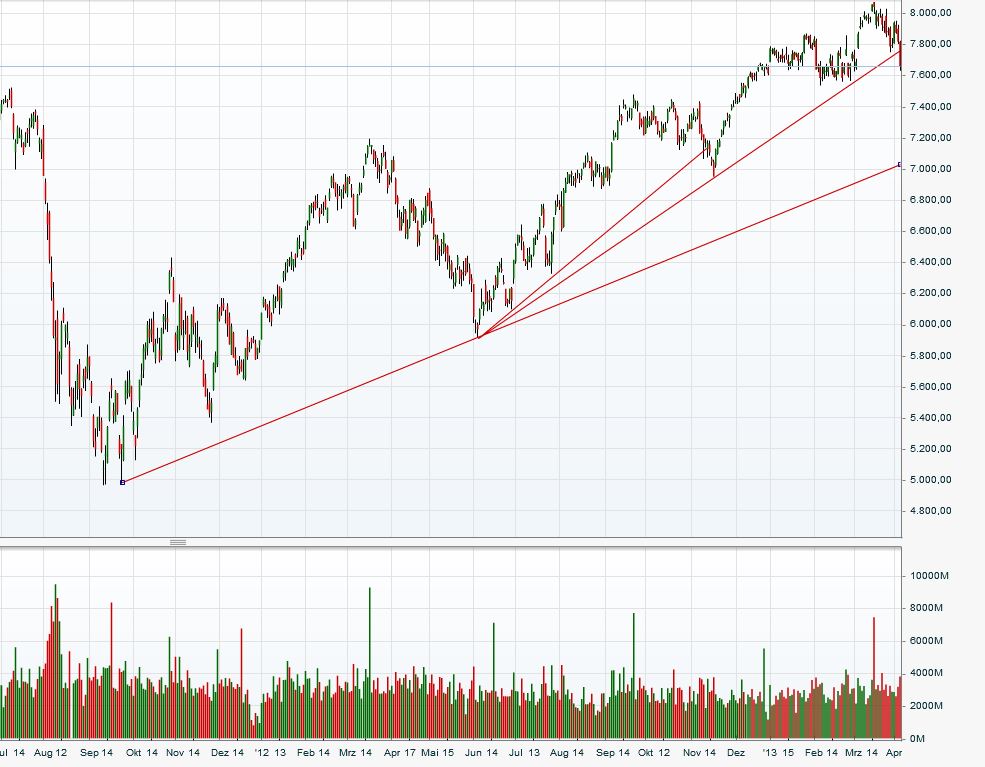 Das größere Bild ergibt sich, wenn man sich den 3-Jahreschart anschaut. Dieser wurde nach dem letzten großen Abverkauf (September 2011) dargestellt. Wer noch bis ins Jahr 2009 zurückgeht, der wird noch eine weitere Trendlinie finden, die ungefähr genauso verläuft wie die hier dargestellte Trendlinie. Langfristig orientierten Anlegern sollte das jedenfalls eine Warnung sein. Immerhin in den USA sieht der DOW-Jones weniger angeknackst aus und das könnte den Markt jetzt stützen.