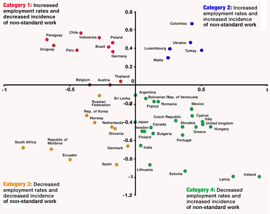 Die Arbeitsmarktforscher bildeten vier Gruppen, welche die Arbeitsmarktsituation in zwei Dimensionen abbilden. Anstieg der Beschäftigung und Qualität der Arbeitsplätze. Deutschland steht in der Tat gut da. Aber zu denken geben sollten die europäischen Partner. Selbst in Schweden nimmt die Qualität der Arbeit ab. Auch Frankreich. UK und Italien schneiden schlecht ab (Kategorie 4). Außerdem alarmierten die Forscher Hinweise auf soziale Unruhen.