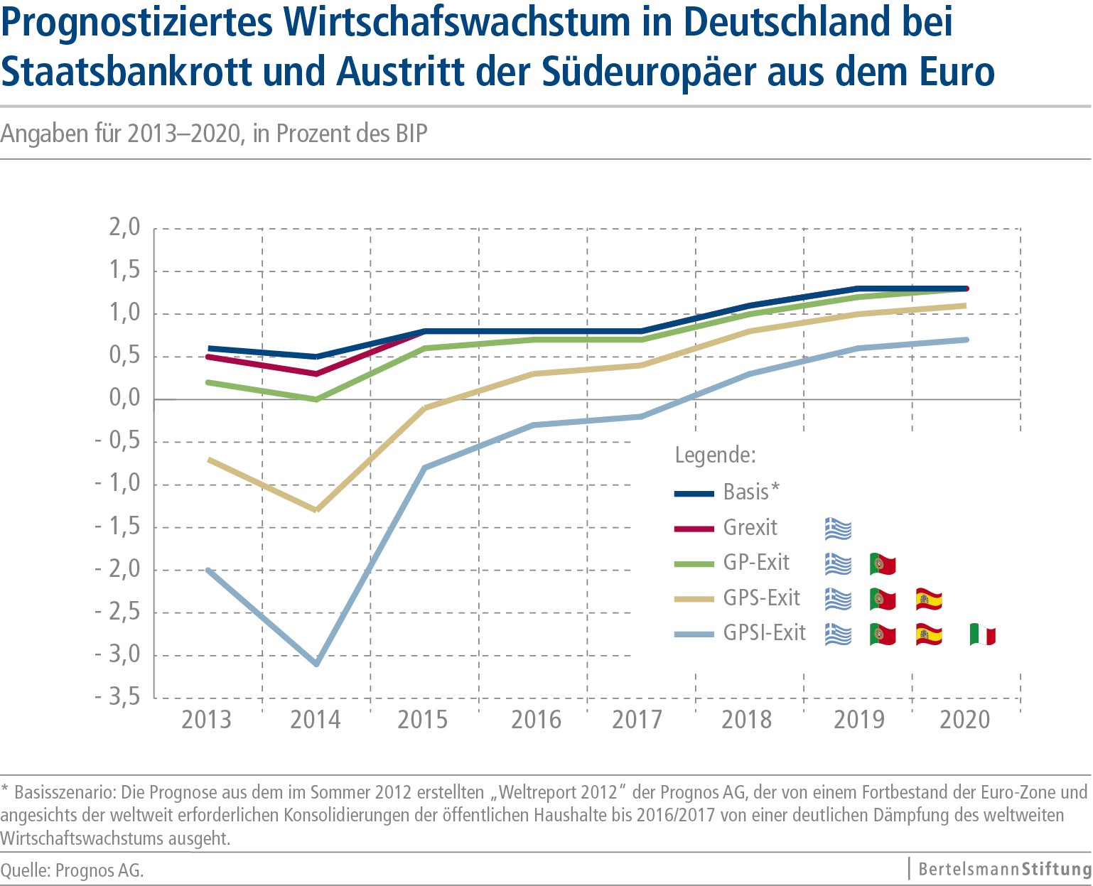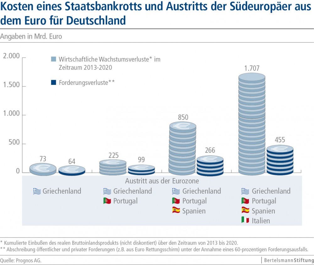 Allein der isolierte Austritt Griechenlands würde für Deutschland zunächst Einbußen in der Wirtschaftsleistung von insgesamt 73 Milliarden Euro bis zum Jahre 2020 bedeuten. Pro Kopf berechnet wäre dies ein Wachstumsverlust von etwa 900 Euro über acht Jahre und damit relativ gering. Die einmalig anfallenden Kosten durch Abschreibungen auf Forderungen von privaten und öffentlichen Gläubigern in Deutschland beliefen sich auf 64 Milliarden Euro.