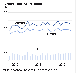 Internationale Beobachter interessiert vor allem die Handelsbilanz, also die Differenz zwischen Exporten und Importen. Diese wies im August 2012 einen saison- und kalenderbereinigten Überschuss von 18,3 Milliarden Euro aus. In Staaten der Europäischen Union (EU) wurden im August 2012 Waren im Wert von 48,7 Milliarden Euro versandt und für 45,0 Milliarden Euro von dort bezogen. In die Euroländer wurden im August 2012 Waren im Wert von 30,4 Milliarden Euro geliefert und Waren im Wert von 31,5 Milliarden Euro bezogen.