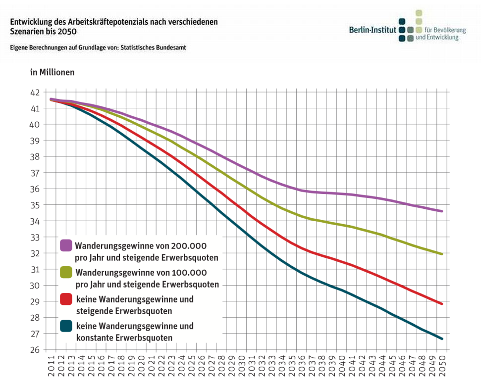Nur wenn in Deutschland das Thema Einwanderung mit anderen Augen gesehen wird, können wir den Absturz abmildern. Selbst bei einem Wanderungsgewinn (Saldo zwischen Einwanderern und Auswanderern) von 200.000 Erwerbstätigen plus steigende Erwerbsquoten verringert sich die Zahl der Arbeitnehmer von 42 Millionen auf etwa 36 Millionen.