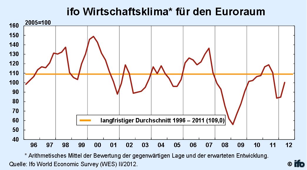 Hinweis: Die ifo Expertenumfrage zur Weltkonjunktur erfasst wirtschaftliche Trends durch die Befragung von volkswirtschaftlichen Experten aus multinationalen Unternehmen und international agierenden Institutionen. Die zusammengefassten Ergebnisse der Weltumfrage werden am 16. Mai 2012 veröffentlicht. Die Ergebnisse für den Euroraum basieren im April 2012 auf den Meldungen von 279 Experten. Die Umfrage wird in Zusammenarbeit mit der Internationalen Handelskammer (ICC) in Paris durchgeführt.