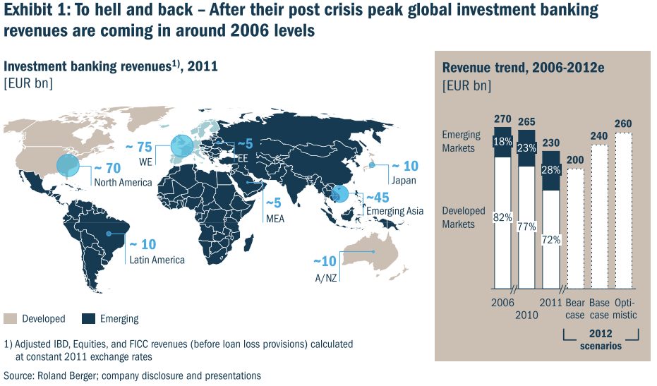 So gehen die Roland Berger-Experten davon aus, dass die IB-Branche im laufenden Jahr das globale Ertragsvolumen von 230 Milliarden Euro vom Jahr 2011 kaum übertreffen wird. Sollte sich jedoch das Marktumfeld weiter erhärten, könnten die globalen Jahreserträge sogar auf 200 Milliarden Euro fallen (-15%).