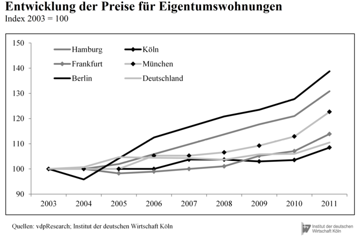 In Hamburg zogen die Preise für Eigentumswohnungen von 2003 bis 2011 um 31 Prozent an. In Berlin legten die Preise sogar um 39 Prozent zu. In München und Frankfurt am Main waren moderatere Preissteigerungen von 23 und 14 Prozent zu beobachten. Die Wissenschaftler des IW gaben jedoch Entwarnung, denn eine Preisblase wie in den USA, Irland oder Spanien sei nicht zu erkennen. Trotz extrem niedriger Zinsen sei weder eine expansive Kreditvergabe noch eine sehr hohe Kauf- und Wiederverkaufsrate zu beobachten.