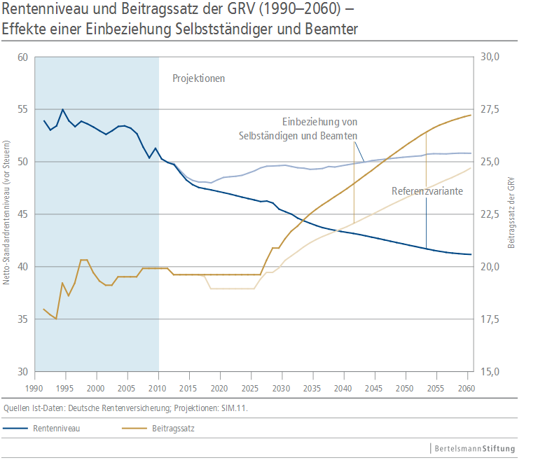 RentenniveauEine aktuelle Studie der Universität Bochum im Auftrag der Bertelsmann Stiftung kommt zu dem Ergebnis, dass ohne neue Weichenstellungen ein weiterer Rückgang des Rentenniveaus und steigende Beiträge unvermeidlich sind. Denn weder der technologische Fortschritt, noch weiter Qualifikation der Arbeitnehmer hilft nach Ansicht der Autoren zur Kompensation der Demografiefalle der Altersvorsorge aus. Das geht zumindest aus neuen Projektionen hervor. Eine andere populäre Idee, Selbstständige und Beamte zu Beiträgen heranzuziehen bringt auch nur scheinbar Entlastung, denn mehr Beitragszahler bringen auch neue Anspruchsberechtigte hervor.