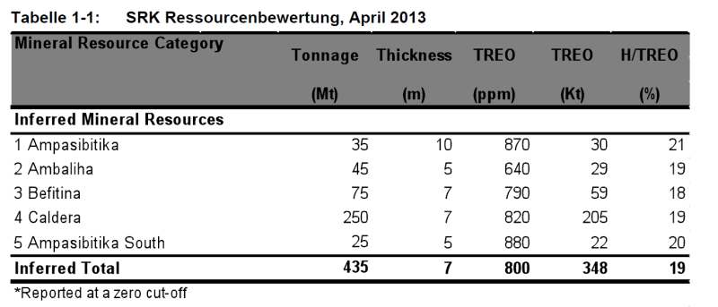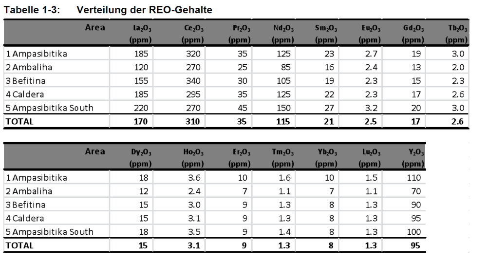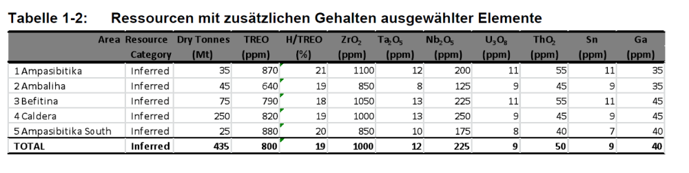 Eine komplette Aufstellung der mineralischen Ressourcen inklusive der Seltenerdoxidgehalte wird separat auf der Internetseite von TRE veröffentlicht. Analysen des TRE-Materials zeigten, dass etwa 19% der REO zu den schweren seltenen Erden zählen, daneben wurde auch ein hoher Anteil an Neodym festgestellt.