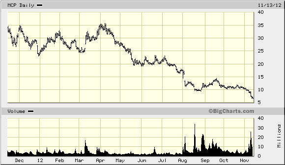 Der Aktienkurs von Molycorp war getrieben von den zahlreichen Berichten über Seltene Erden. Scheinbar jeder spekulativ orientierte Anleger war 2011 auf der Suche nach dem Heiligen Gral, um sich am Boom zu beteiligen. Molycorp notierte im April 2011 mit einem Aktienkurs von in der Spitze 80 USD. Seither kennt der Wert nur eine Richtung. Am Dienstag (13.11.2012) lag der Kurs bei nur noch 6,67 USD.