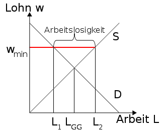 Ökonomen lernen in der ersten Stunde bereits, dass Märkte mit Markteingriffen Ungleichgewichte produzieren. Wird in den statischen Markt mit einem Mindestpreis über dem bisherigen Gleichgewichtspreis eingegriffen, dann wir der Markt nicht geräumt und es kommt zu einem Überangebot. In diesem Fall entsteht Arbeitslosigkeit.