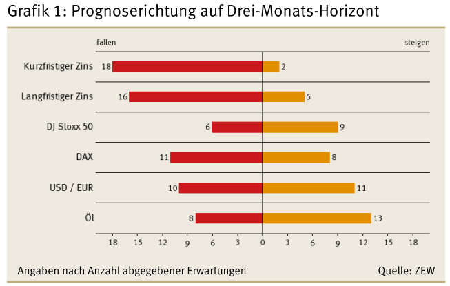 Ausgehend von einem Drei-Monats-Euribor von 0,653 Prozent erwarten die teilnehmenden Banken des ZEW-Prognosetest bis zum Ende des dritten Quartals einen minimalen Rückgang auf durchschnittlich 0,59 Prozent. Das Spektrum der Erwartungen erstreckt sich dabei von 0,40 Prozent (HSBC Trinkaus Burkhardt) bis 0,75Prozent (BHF-Bank). Die Prognosen zum Jahresende liegen mit einer Konsenserwartung von 0,60 Prozent auf nahezu identischem Niveau.