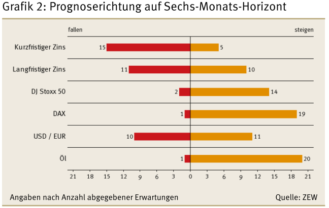 Die Konsenserwartung für den DJ Stoxx 50 liegt auf Drei-Monats-Sicht bei 2.368 Punkten und damit nahe am Wert des Abgabetages von 2.333,42 Punkten. Die Spannbreite der Prognosen reicht hierbei von 2.050 Punkten (Weberbank) bis 2.580 Punkte (Helaba). Auch hier fallen die Erwartungen zum Jahresende optimistischer aus. Die niedrigste Prognose von 2.250 stammt von der Weberbank. HSBC Trinkaus Burkhardt erwartet mit 2.800 Punkten den größten Anstieg. Der Konsenswert liegt bei 2.519 Punkten.